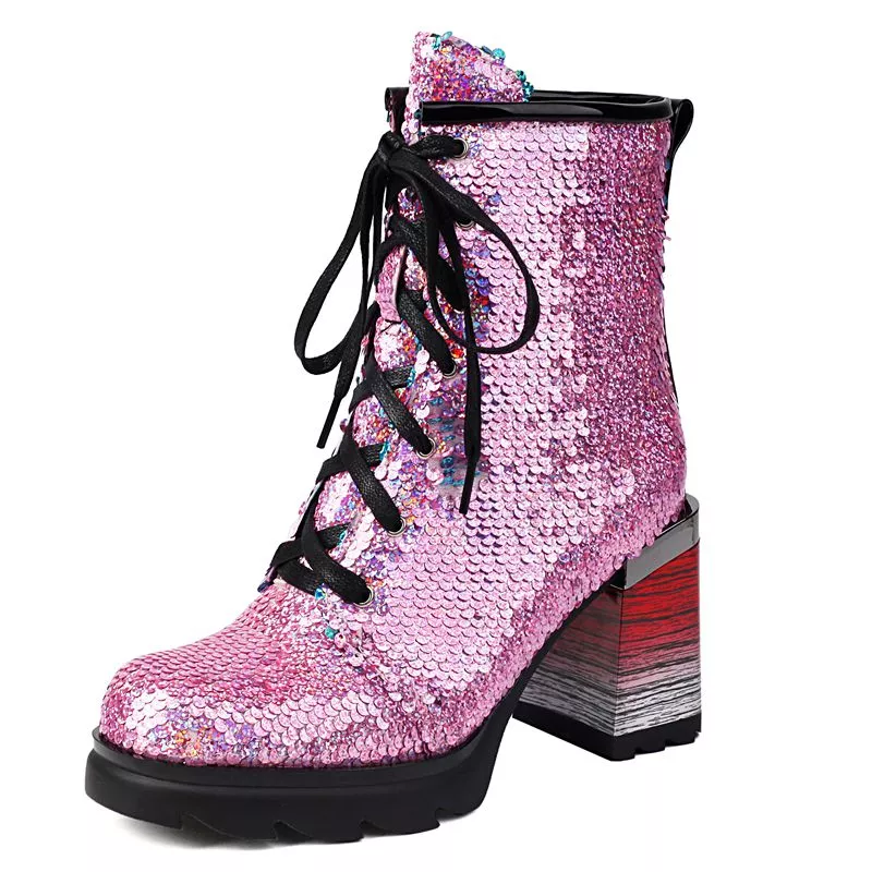 Turn heads wherever you go with these glamorous women’s lace-up ankle boots. Designed with a dazzling sequined shaft and a sleek PU upper, these boots are the perfect mix of bold style and everyday comfort. With their playful sparkle and chic silhouette, they’re made for nights out, date nights, parties, and any moment you want to feel unstoppable. The round toe and lace-up closure give a classic touch, while the super high 3.3 inch block heels and 0.8 inch platform add a flattering lift without compromising balance.