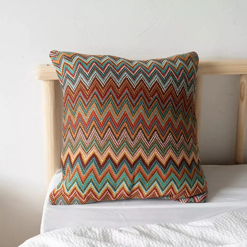 Give your living space a refreshing touch with this beautifully designed bohemian knitted cushion cover. Crafted to combine style and softness, this pillow cover is the perfect way to elevate your sofa, bed, or favorite chair. With its bold zigzag stripes in rich shades of orange, blue, red, and beige, it adds both texture and personality to any room.