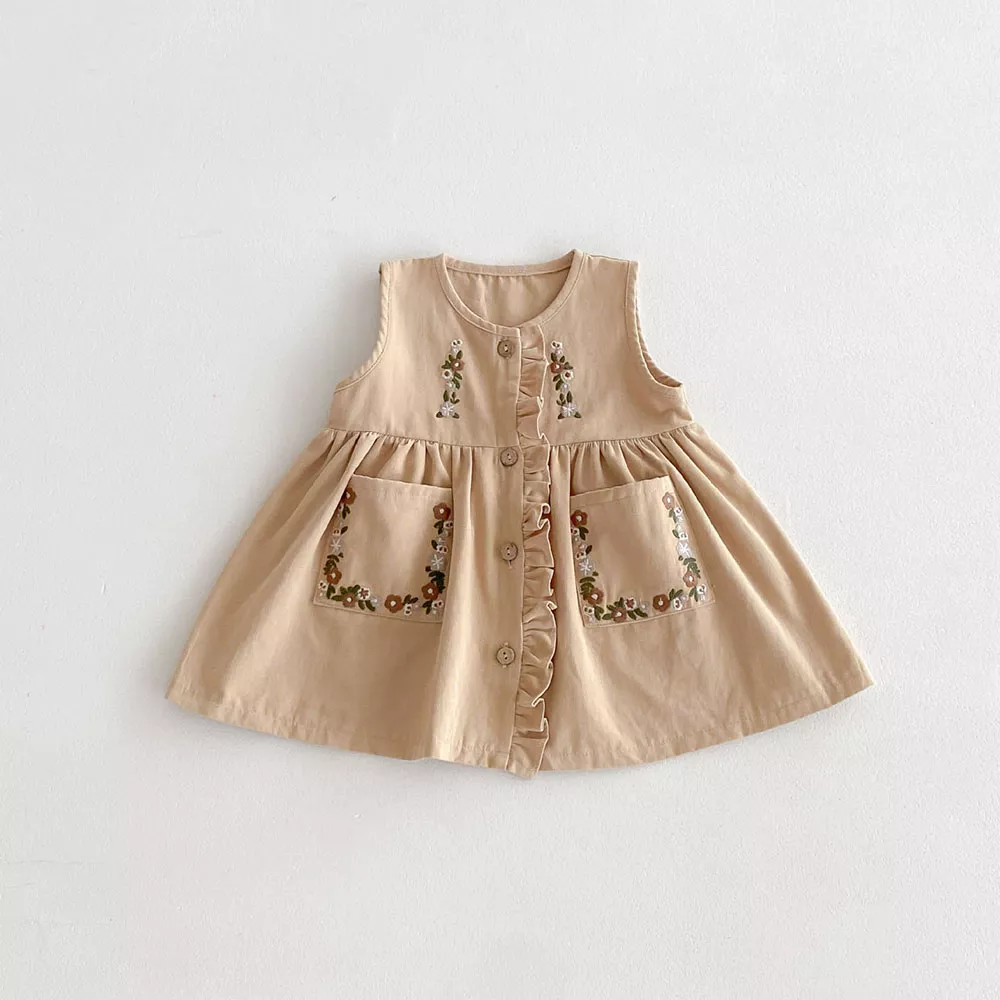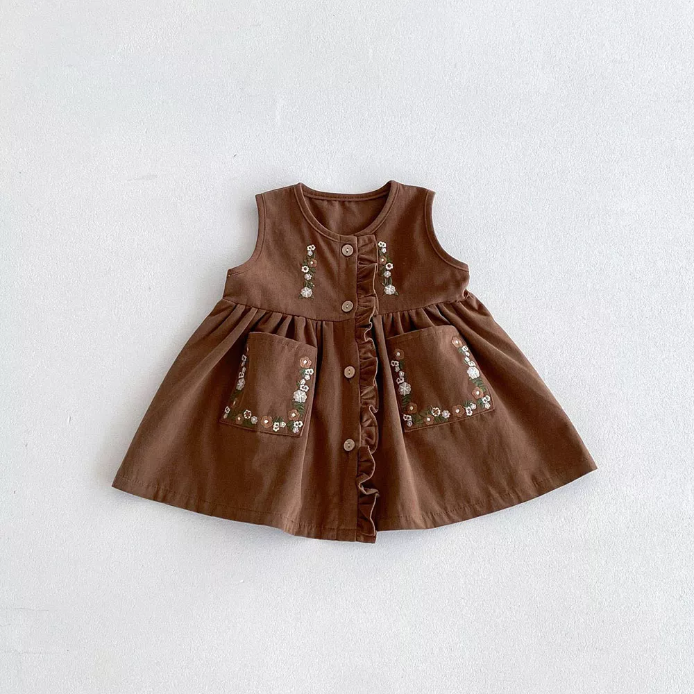 Give your little one the perfect mix of comfort and charm with this adorable embroidered vest dress. Designed for autumn days, this sleeveless A-line dress features delicate floral embroidery, a classic O-neck, and single-breasted button closure for easy wear. Pair it with the optional long-sleeve shirt for a layered look, or let her wear it on its own for a lighter feel. The knee-length cut adds elegance while allowing freedom to move and play.