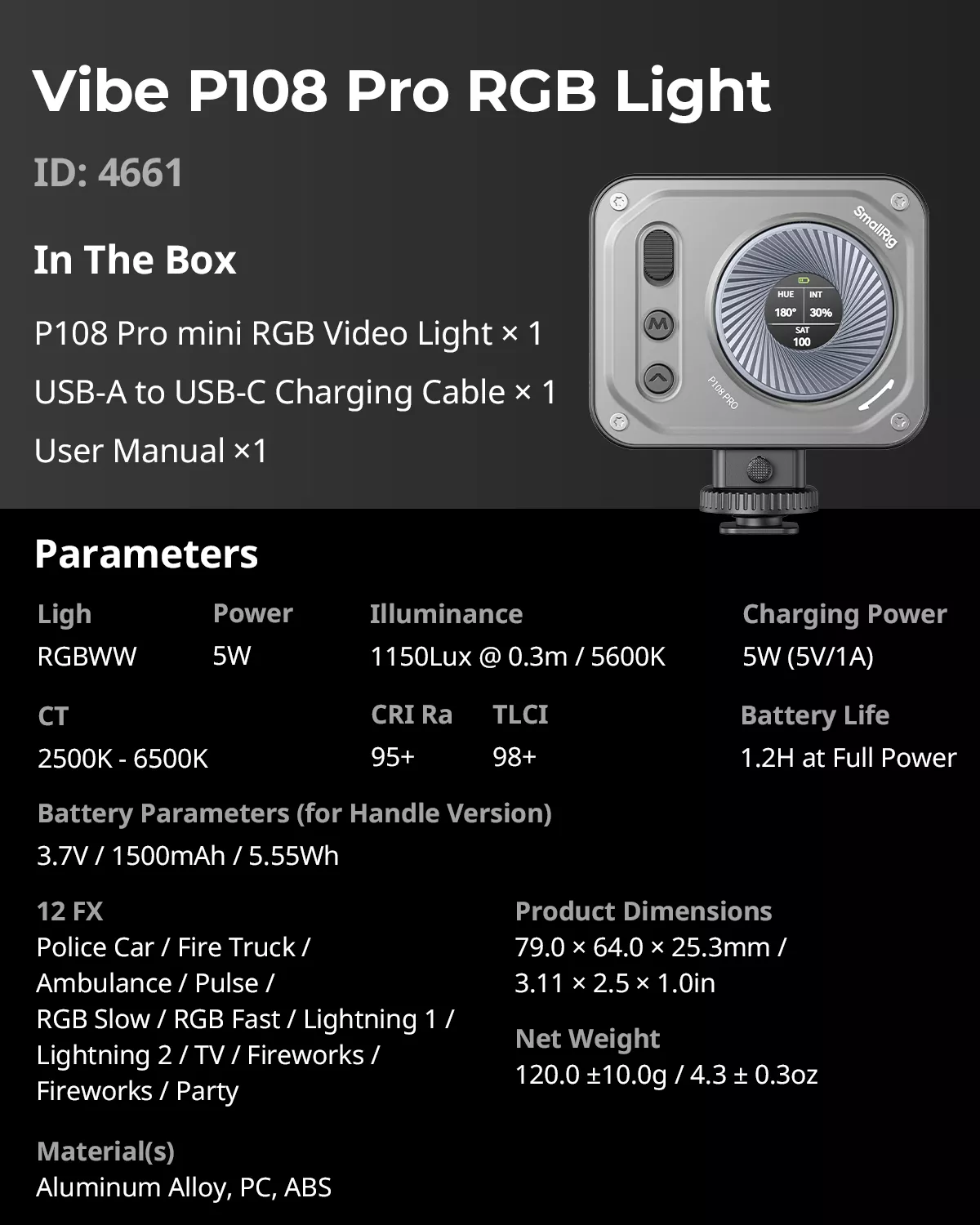 Despite its pocket-sized design, this light packs impressive performance. The 5W RGBWW light source provides 1140 Lux at 0.3 ft with outstanding color accuracy (CRI 95+ and TLCI 98+). A built-in LCD screen makes it simple to adjust brightness and color with one hand. The integrated 1500mAh battery supports up to 3 hours of shooting, while the USB-C fast charging keeps you ready to create without long interruptions.