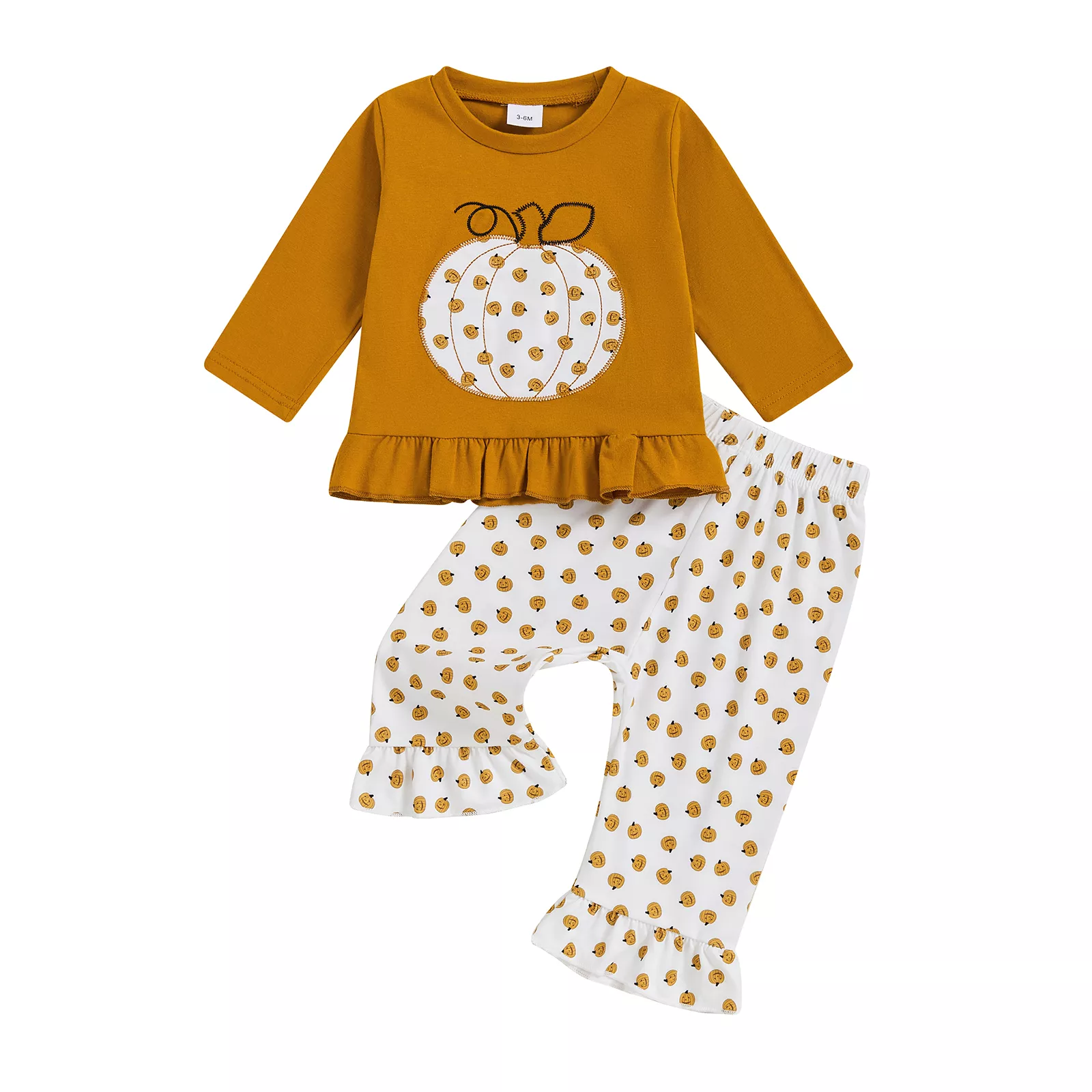 Get your little one ready for spooky season with this charming Halloween two-piece outfit. Designed for baby girls from 3 months up to 3 years, this set includes a pumpkin embroidery long sleeve shirt with a round neckline and ruffled hem, paired with comfortable elastic waist pants. Made with a soft cotton blend top and easy-care polyester pants, this outfit is gentle on delicate skin while allowing your toddler to move, play, and explore with ease.