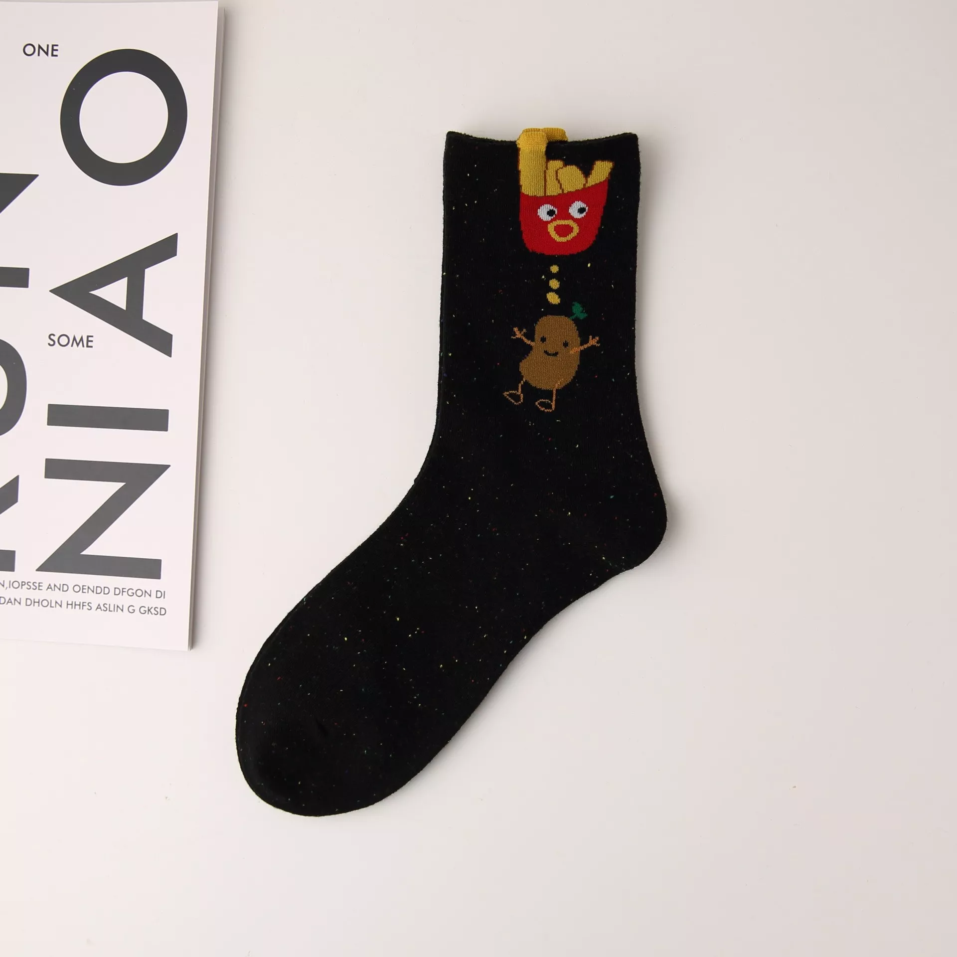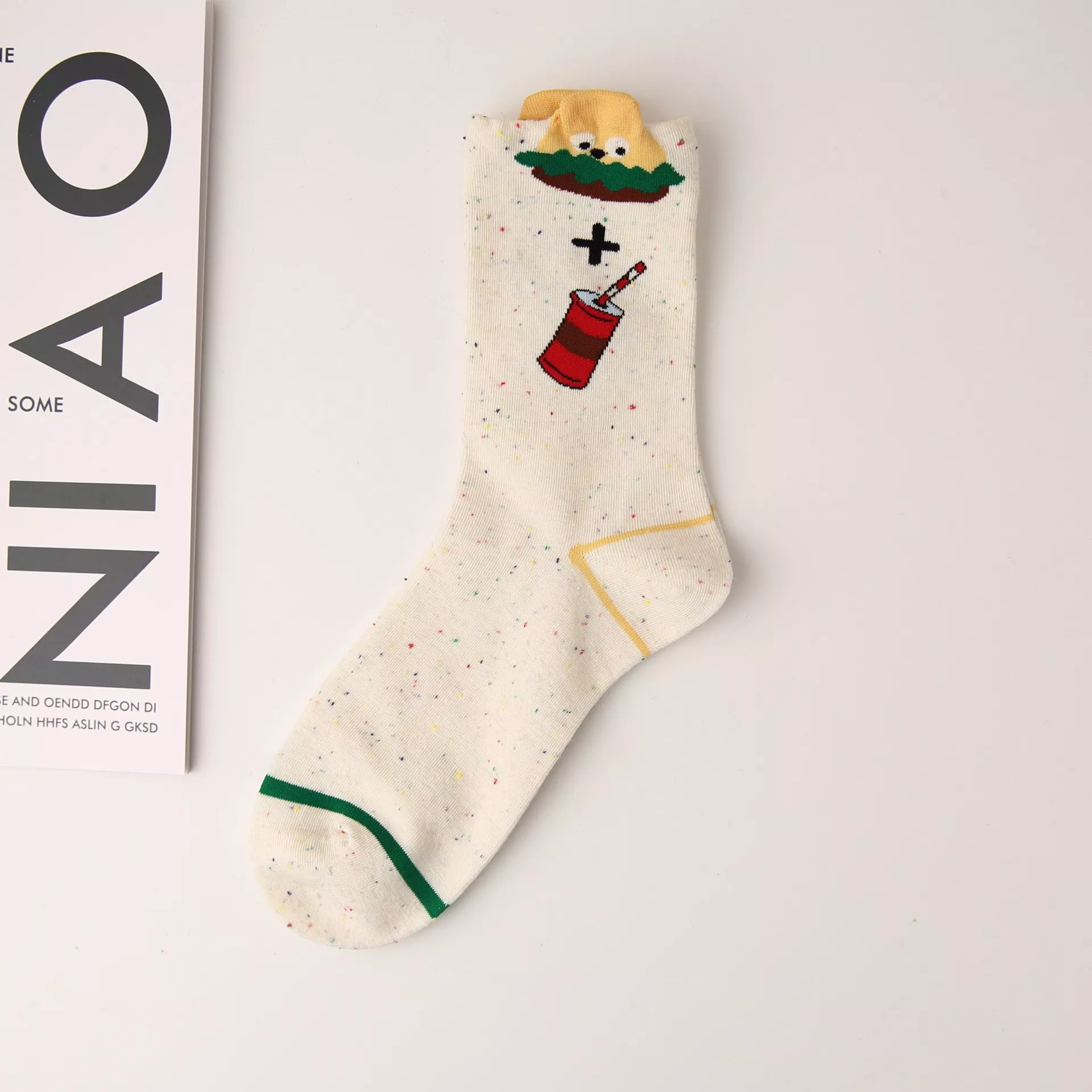 Women’s Cute Cartoon Burger & Fries Cotton Socks – Fun Kawaii Casual Mid Tube