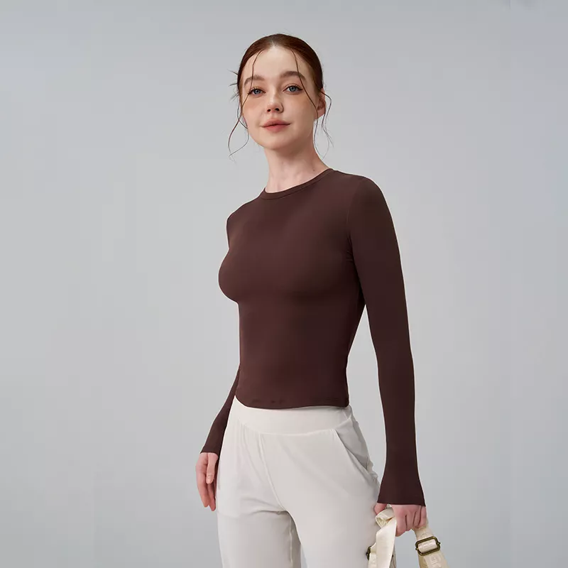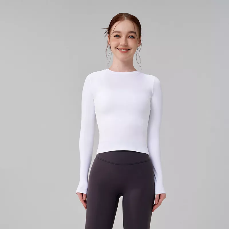 Step into comfort and performance with this sleek long sleeve yoga and fitness top, designed to keep up with your every move. Made from a premium blend of 91% nylon and 9% spandex, this top offers a perfect balance of softness, stretch, and durability. With a classic O-neck design and slim fit, it delivers a flattering silhouette while supporting you through every squat, stretch, and sprint.